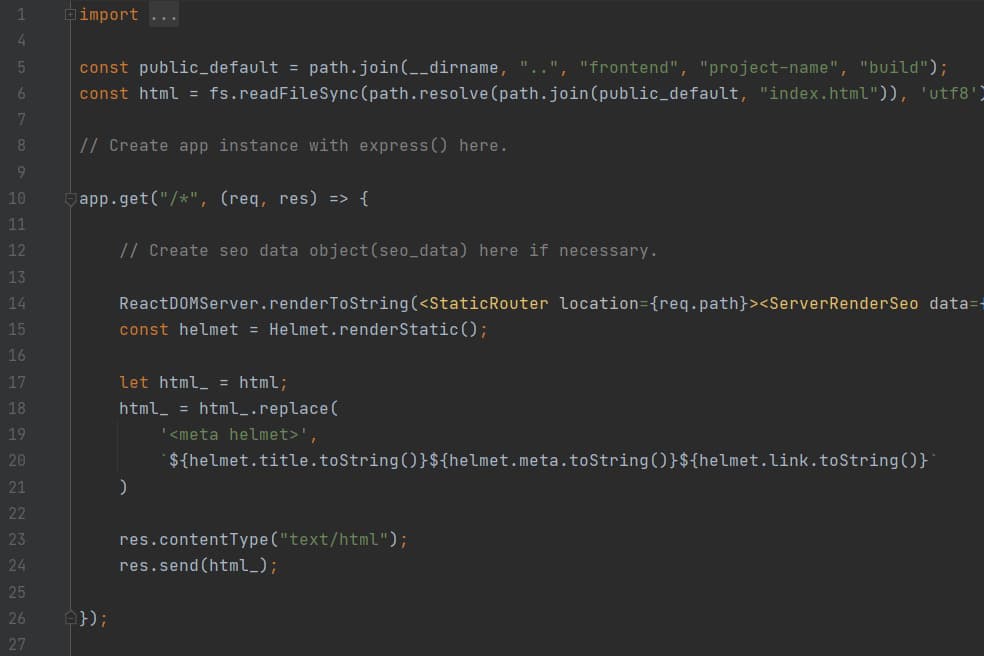 import {StaticRouter} from 'react-router'; import ReactDOMServer from 'react-dom/server'; import Helmet from "react-helmet"; const public_default = path.join(__dirname, "..", "frontend", "project-name", "build"); const html = fs.readFileSync(path.resolve(path.join(public_default, "index.html")), 'utf8'); // Create app instance with express() here. app.get("/*", (req, res) => { // Create seo data object(seo_data) here if necessary. ReactDOMServer.renderToString(<StaticRouter location={req.path}><ServerRenderSeo data={seo_data}/></StaticRouter>); const helmet = Helmet.renderStatic(); let html_ = html; html_ = html_.replace( '<meta helmet>', `${helmet.title.toString()}${helmet.meta.toString()}${helmet.link.toString()}` ) res.contentType("text/html"); res.send(html_); });