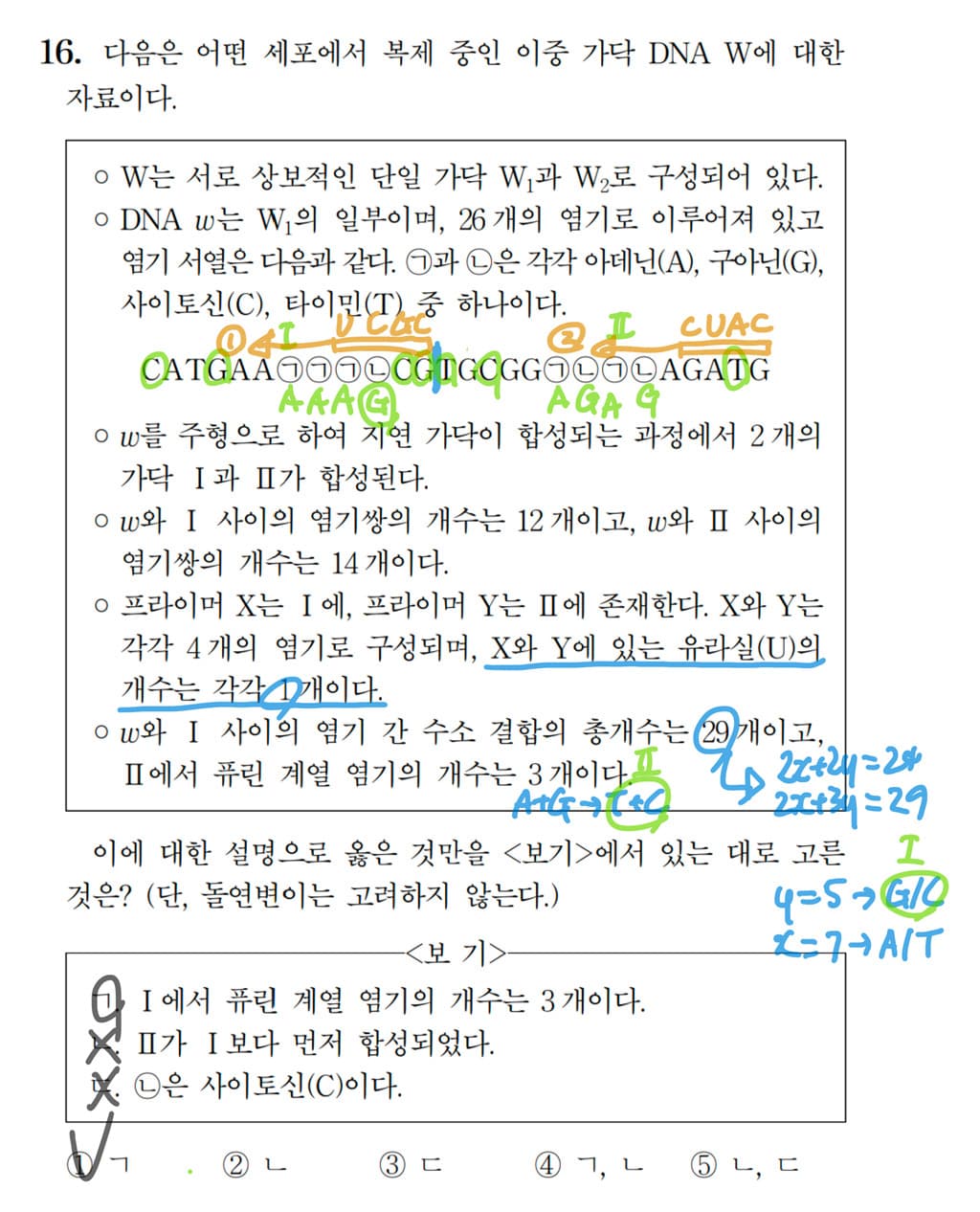- I에서 퓨린계열 염기의 수는 주어진 서열의 왼쪽 12 염기 중 피리미딘 계열 염기의 수와 같으므로, 3개가 맞다. (O)