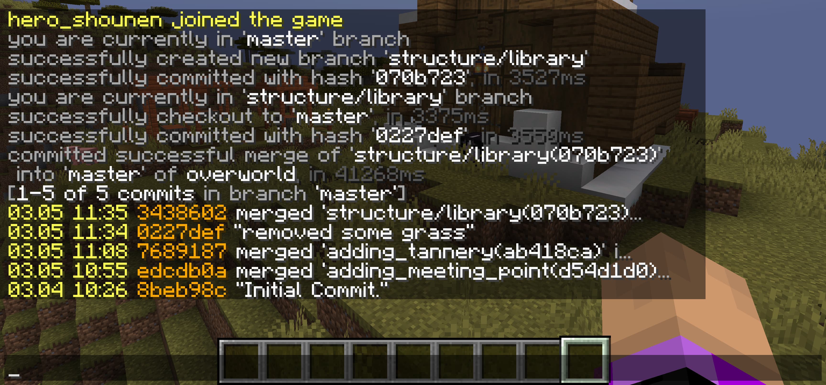 이 과정으로 플레이어는 서버로부터 로그아웃하거나 서버를 켜고 끄지 않아도 커밋/리셋/브랜치/체크아웃을 수행할 수 있게 되었다.