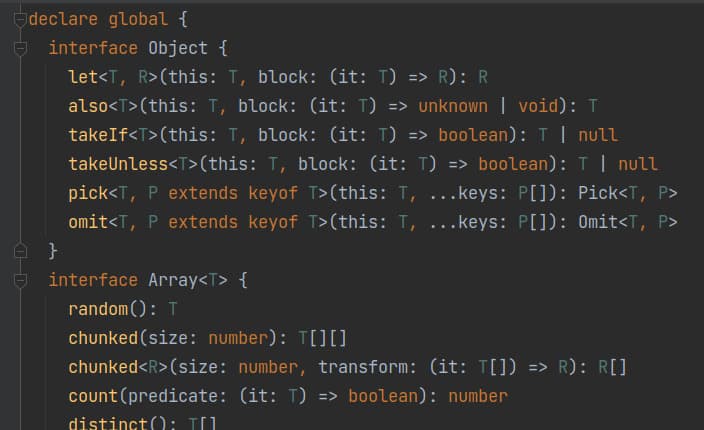 declare global { interface Object { let<T, R>(this: T, block: (it: T) => R): R // ... } }